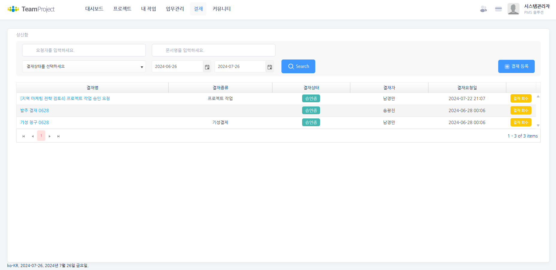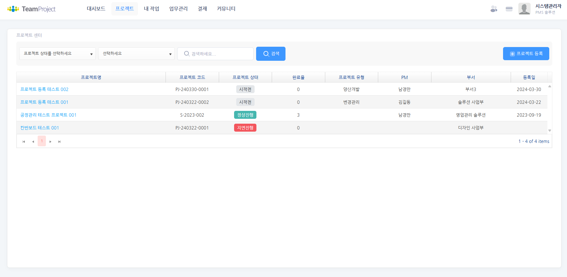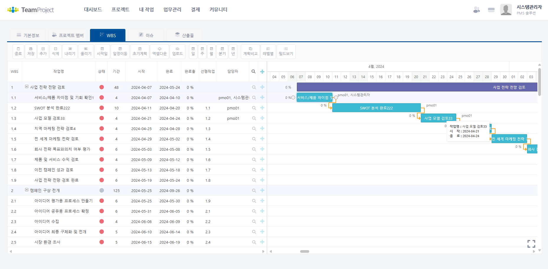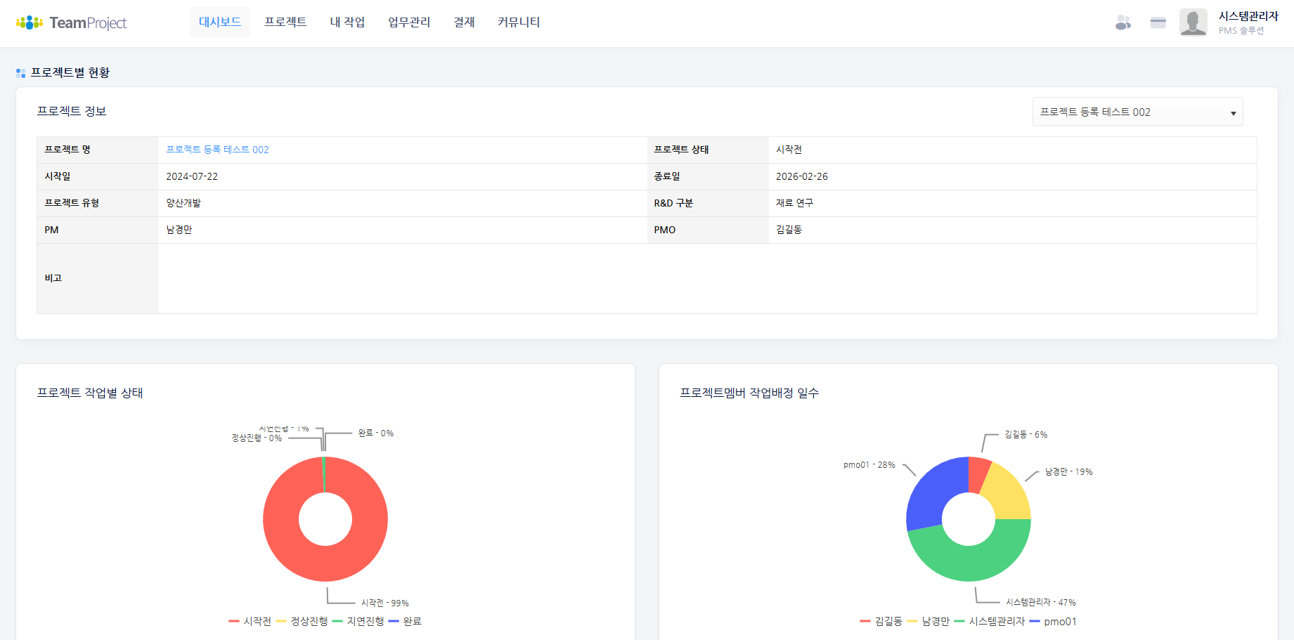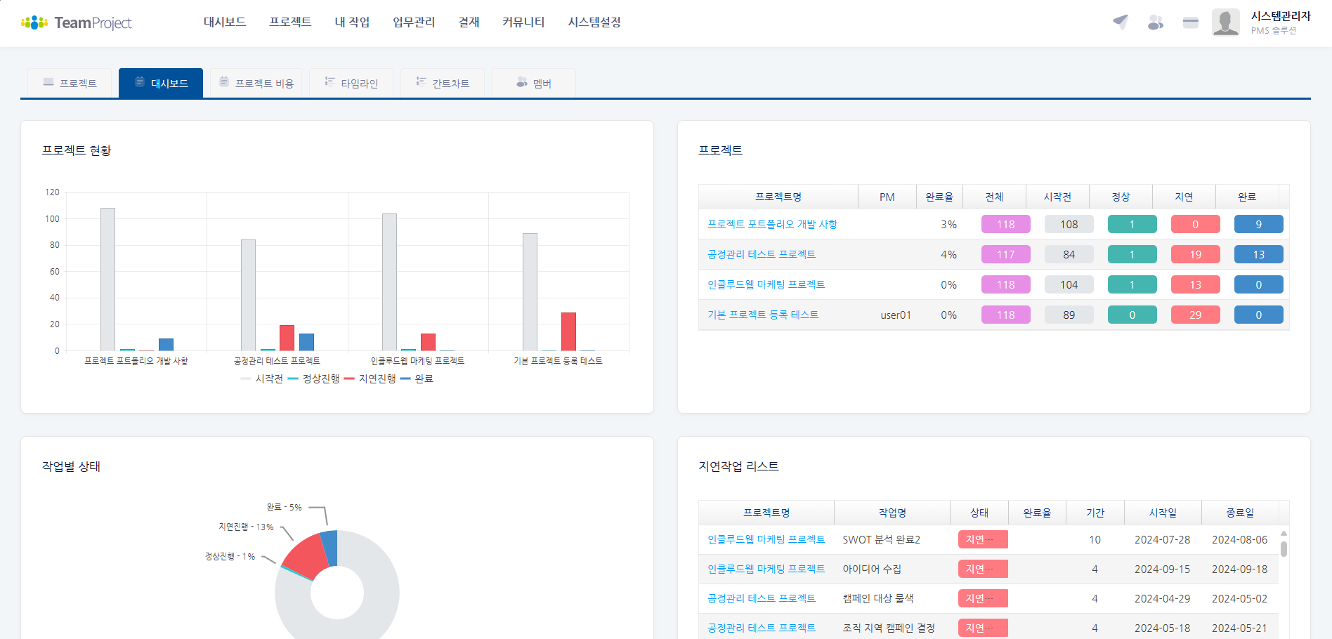 프로젝트 대시보드는 프로젝트의 전반적인 상태를 한눈에 파악할 수 있습니다.